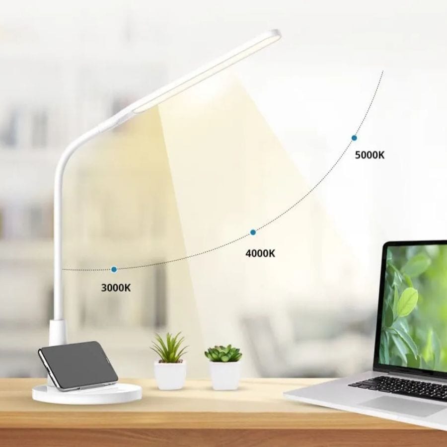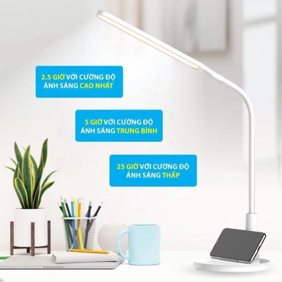 Một điểm cộng lớn của đèn bàn này là thiết kế đế đựng điện thoại thông minh. Bạn có thể dễ dàng đặt điện thoại lên đế đựng khi sử dụng đèn. Tiện lợi cho việc theo dõi các cuộc gọi, tin nhắn hay xem video trong khi học. Thiết kế này mang lại sự gọn gàng và tiết kiệm không gian cho bàn làm việc.